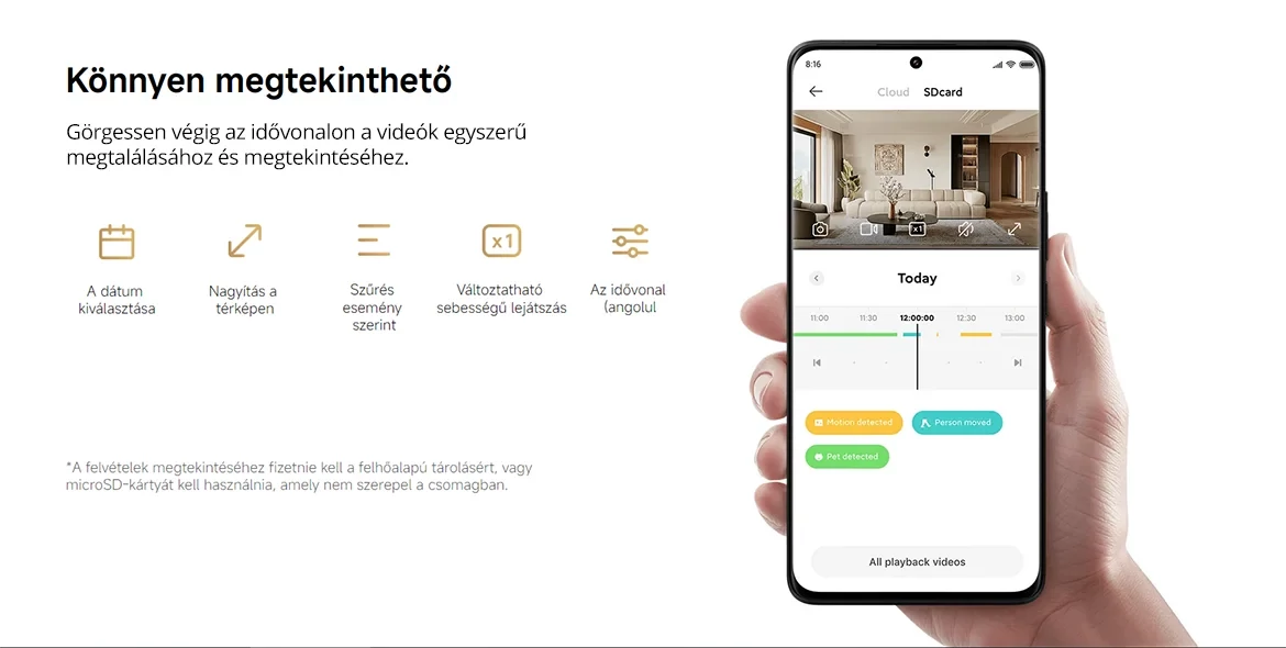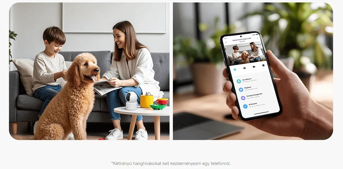 *A Xiaomi Home alkalmazás 7 napos gördülő videotárolási szolgáltatást biztosít a készüléknek három hónapig. A kiterjesztett videotárhelyhez a felhőalapú tárolási szolgáltatásra való előfizetés vagy külön megvásárolható microSD-kártya szükséges. (A felhőalapú tárolási szolgáltatások szabályzatai régiónként és országonként eltérőek lehetnek. Kérjük, olvassa el a Xiaomi Home alkalmazást a részletekért.)