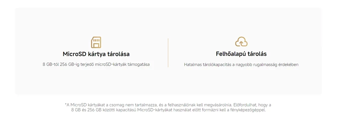 | Raktározás | MicroSD-kártya (8–256 GB támogatott)/Felhőalapú tárhely |